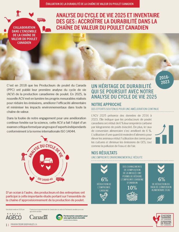 L’évaluation réalisée par le Groupe AGÉCO portait sur les émissions de gaz à effet de serre, la consommation d’eau et d’autres facteurs environnementaux associés à la production de poulet, de la ferme à la transformation. Depuis la dernière évaluation complète réalisée en 2016, le bilan de carbone par kilogramme de poulet éviscéré a diminué de 6 %, ce qui reflète les progrès constants en matière d’efficacité et de pratiques à la ferme.