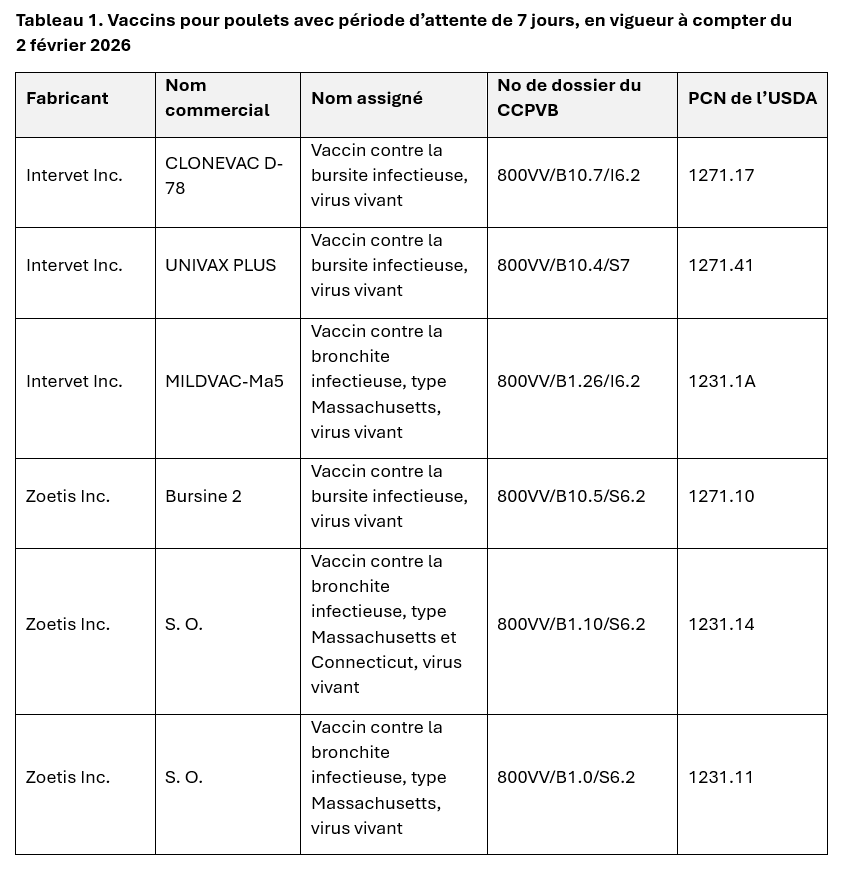 L’Agence canadienne d’inspection des aliments (ACIA) modifie le délai d’attente pour certains vaccins destinés à la volaille, ce qui permettra une plus grande souplesse dans leur utilisation. Les informations ci-dessous présentent les vaccins concernés, le calendrier de mise en œuvre et les informations que les producteurs doivent obtenir pour consigner les délais d’attente des vaccins dans la feuille d’information sur le troupeau.
