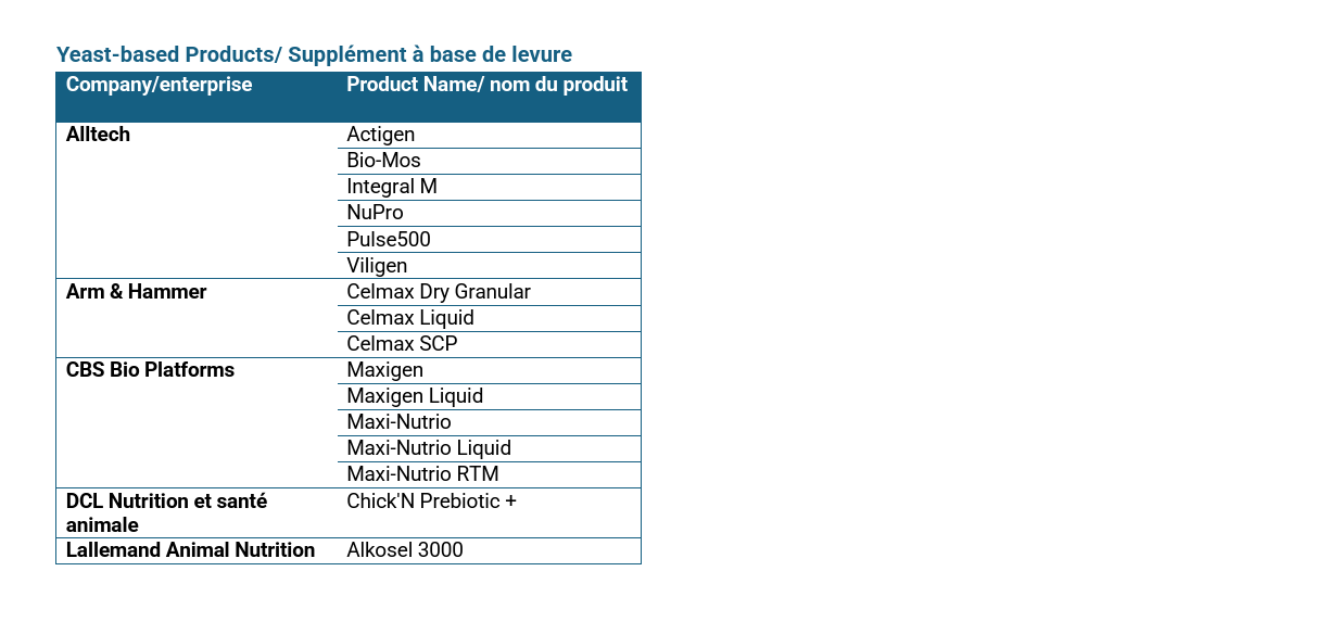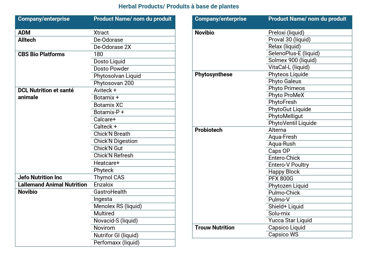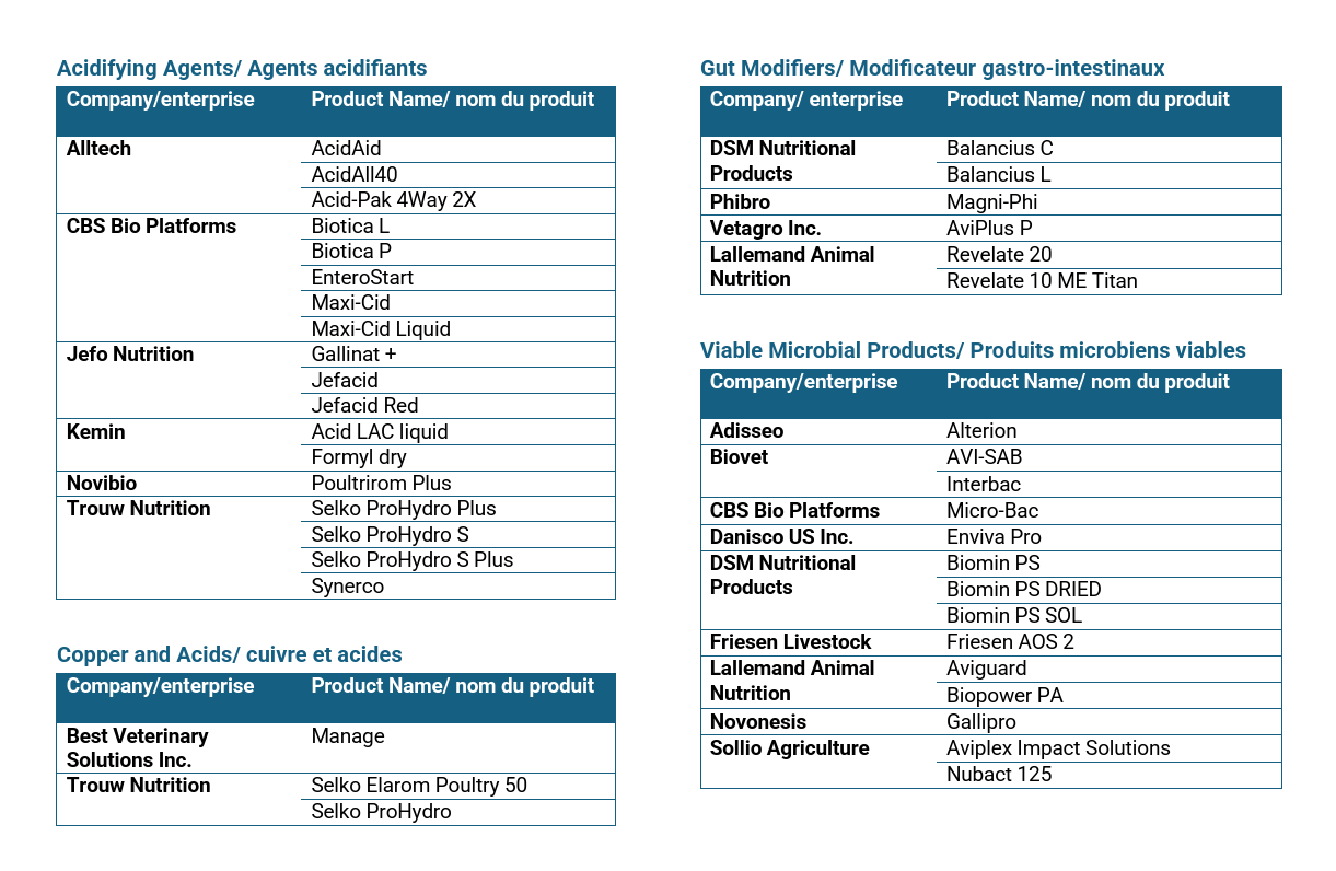 Voici une liste non exhaustive des additifs pour la moulée et l’eau qui sont offerts au Canada. Elle est fournie à titre d’information seulement et ne représente d’aucune façon la totalité de ce qui est offert sur le marché canadien. Elle peut être utilisée pour discuter avec les meuneries, les nutritionnistes et les vétérinaires des produits ou combinaisons de produits qui pourraient être bénéfiques dans diverses exploitations.